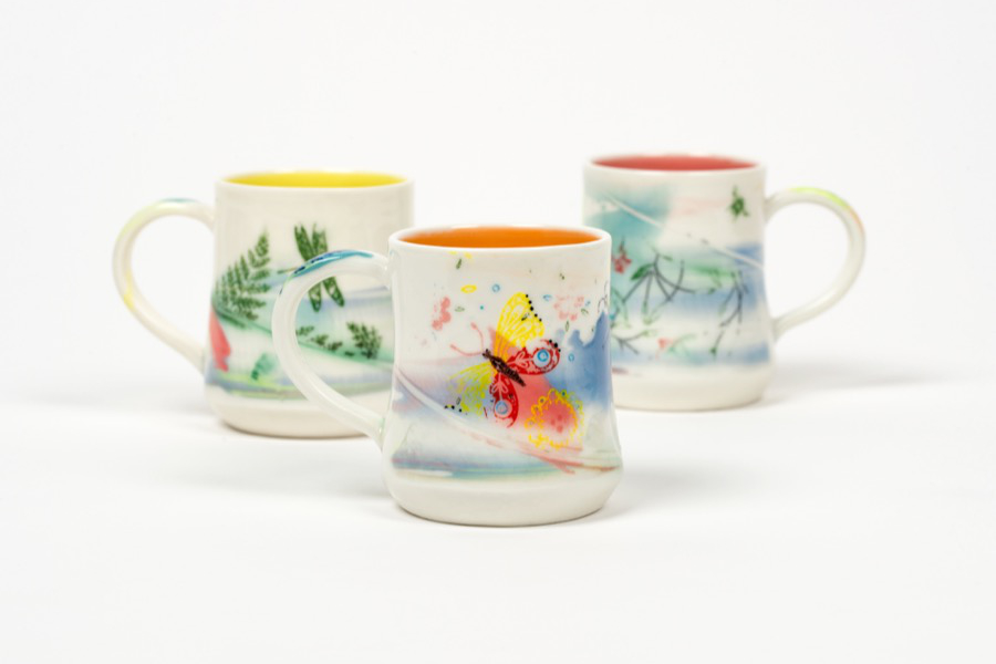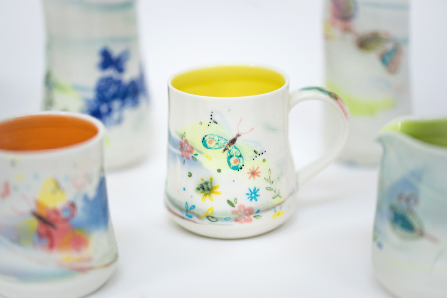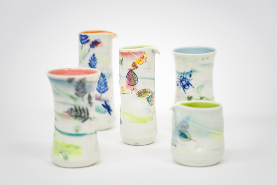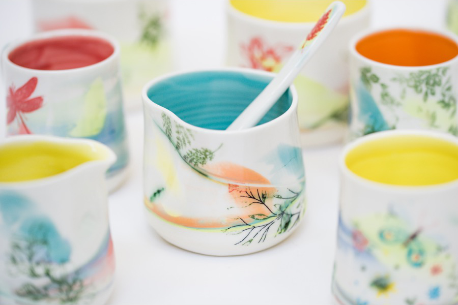 Forms are hand-thrown on a potters wheel in porcelain and the surfaces treated with layered oxides, decals, slips and imprints to create a landscape effect. Each piece is finished with clear and coloured food-safe glazes, creating pieces which can be used and enjoyed everyday.