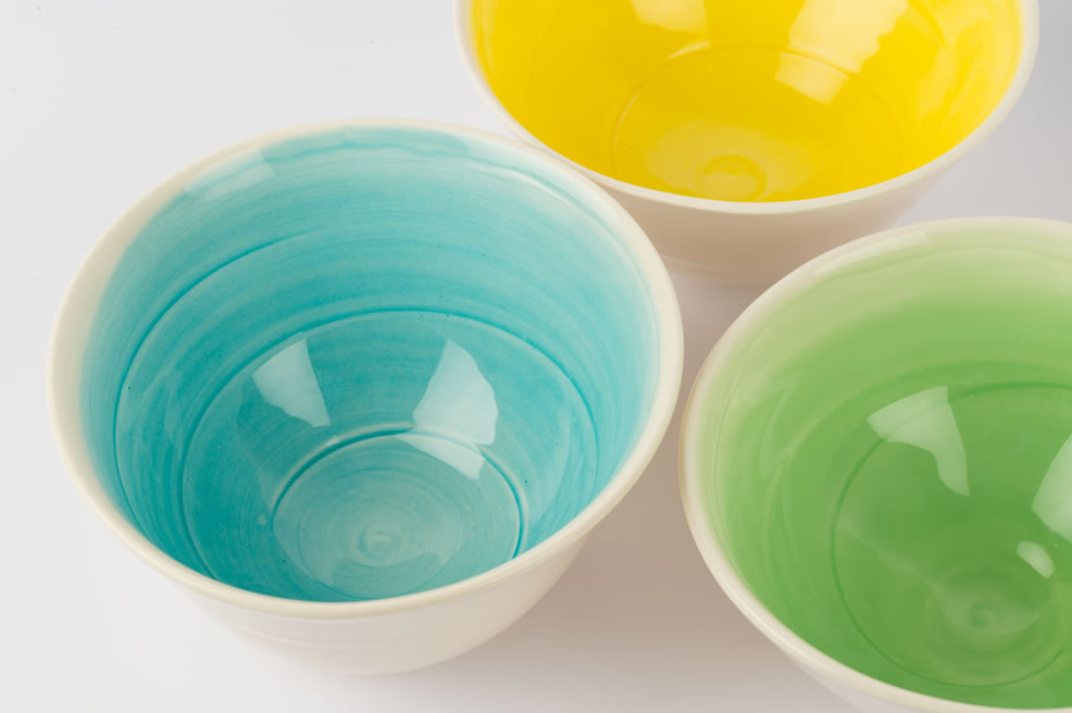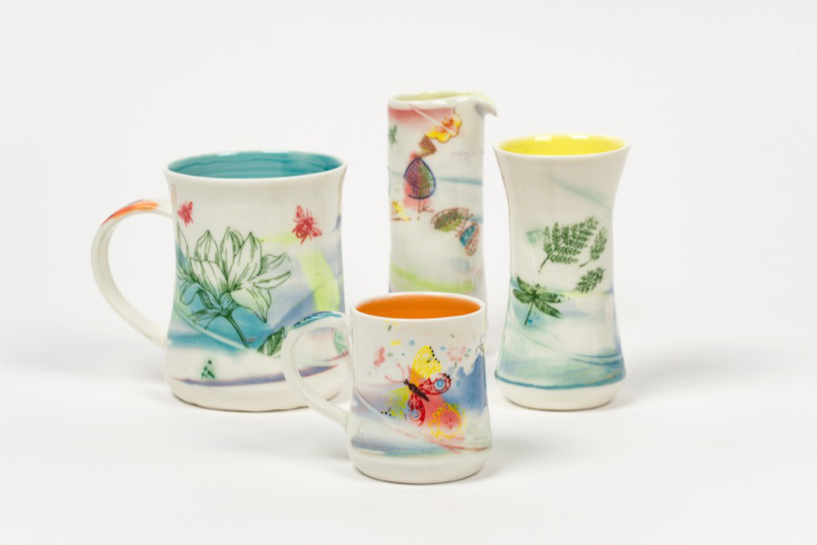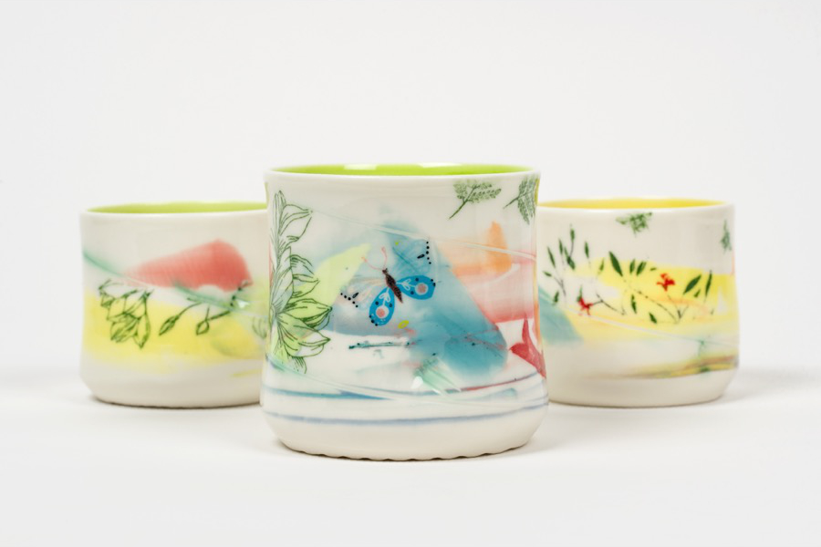 Forms are hand-thrown on a potters wheel in porcelain and the surfaces treated with layered oxides, decals, slips and imprints to create a landscape effect. Each piece is finished with clear and coloured food-safe glazes, creating pieces which can be used and enjoyed everyday.